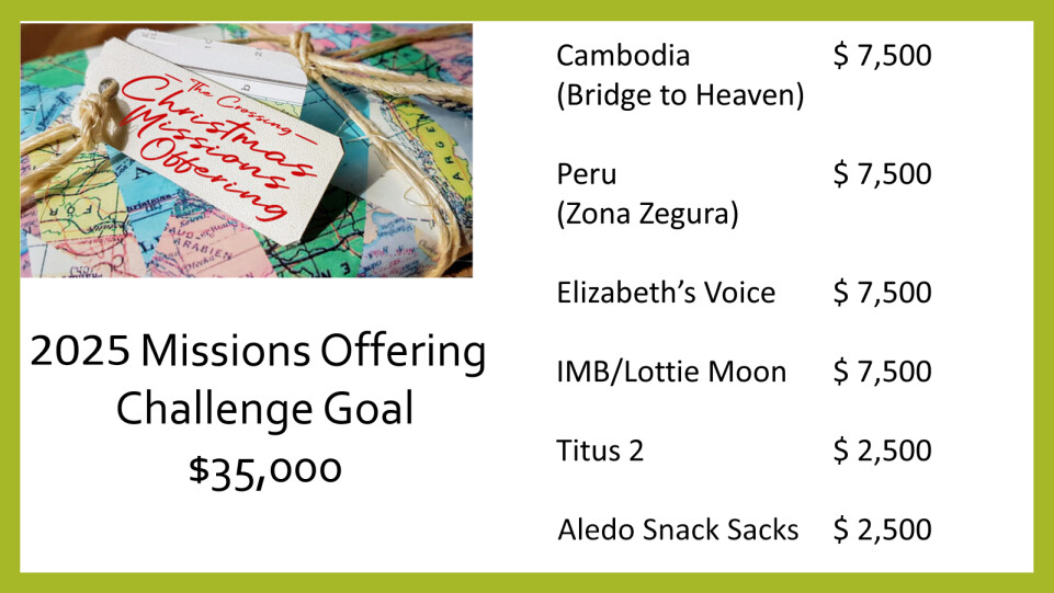 Click HERE to donate to our 2025 Christmas Missions. Under "Recurring" or "One Time", you will find a drop-down menu with the "Christmas Missions" option. You can also give on Sunday mornings or come to the church office Monday through Thursday during working hours.